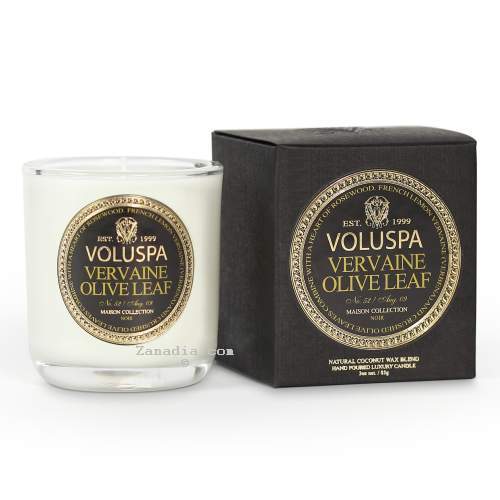 Voluspa Maison Vervaine Olive Leaf Boxed Votive in heavy cased glass.