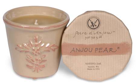 Votivo Anjou Pear candle in terracotta jar from the French Provence collection, Packaged in a reusable terracotta pot.