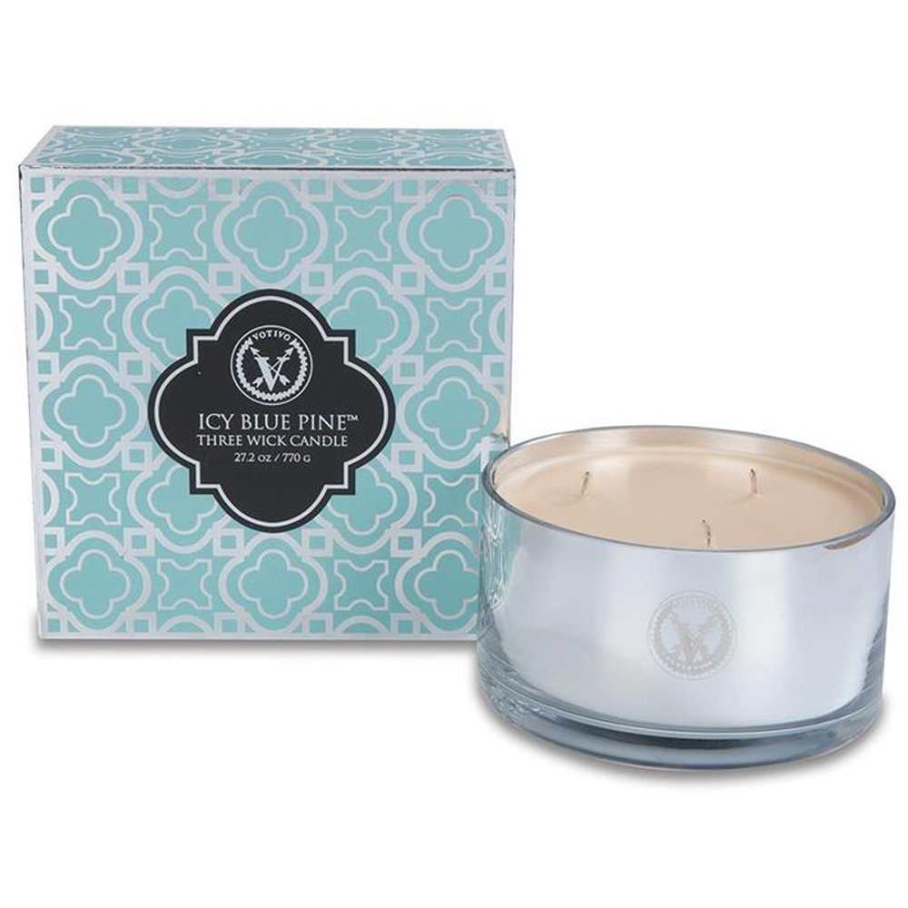 Dramatic extra large 3 wick candle in an impressive metallic glass container.