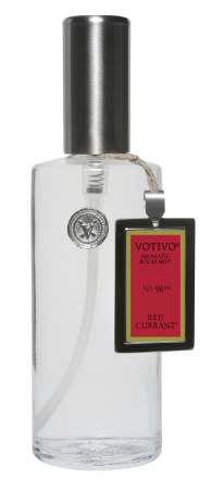 Votivo aromatic Room Spray in Red Currant in a gift box. This room spray is infused with the sumptuous Votivo signature essential oils for a lasting fragrance. 4 Oz. bottle.