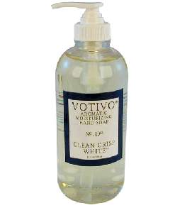 Votivo hand soap pump in Clean Crisp White. Luxurious rich scents found in your favorite Votivo candles are now available in irresistible bath and body care products. Experience the fragrances of Votivo in even more ways! Ingredients include Shea butter and gentle botanical cleansing extracts.