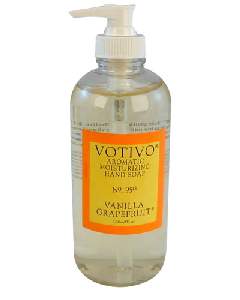 Votivo hand soap pump in Vanilla Grapefruit. Luxurious rich scents found in your favorite Votivo candles are now available in irresistible bath and body care products. Experience the fragrances of Votivo in even more ways! Ingredients include Shea butter and gentle botanical cleansing extracts.